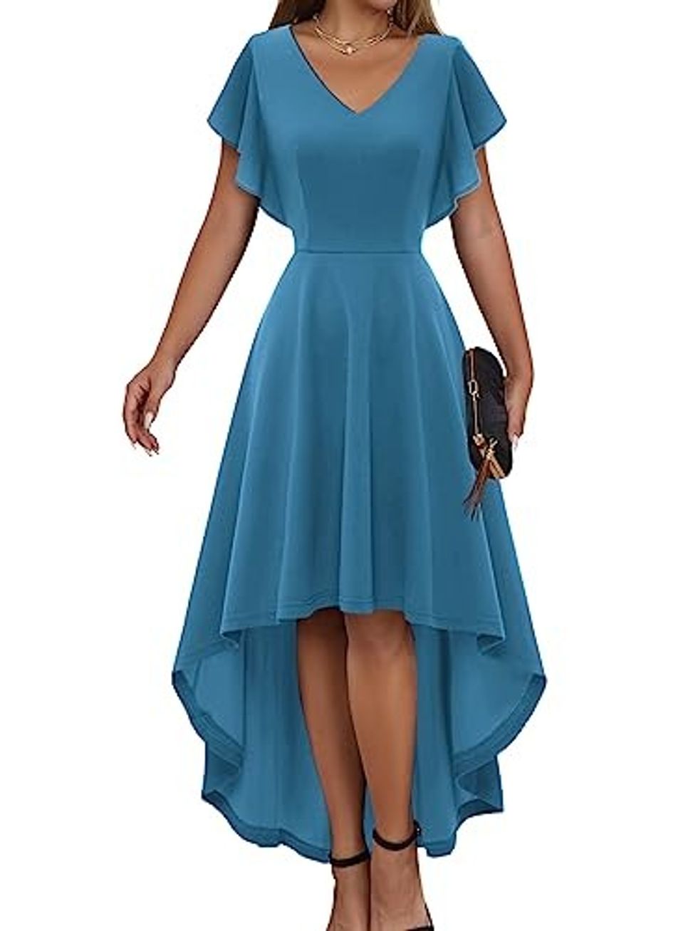 This stunning high-low dress will pair beautifully with any lace-up heels. Featuring a unique cut skirt, it offers versatility in styling. Available in a variety of colors ranging from bright pastels to neutrals, there's an option for every taste. With gorgeous, loose, flowing ruffle sleeves, it's designed to keep you comfortable in the summer heat without compromising your look.