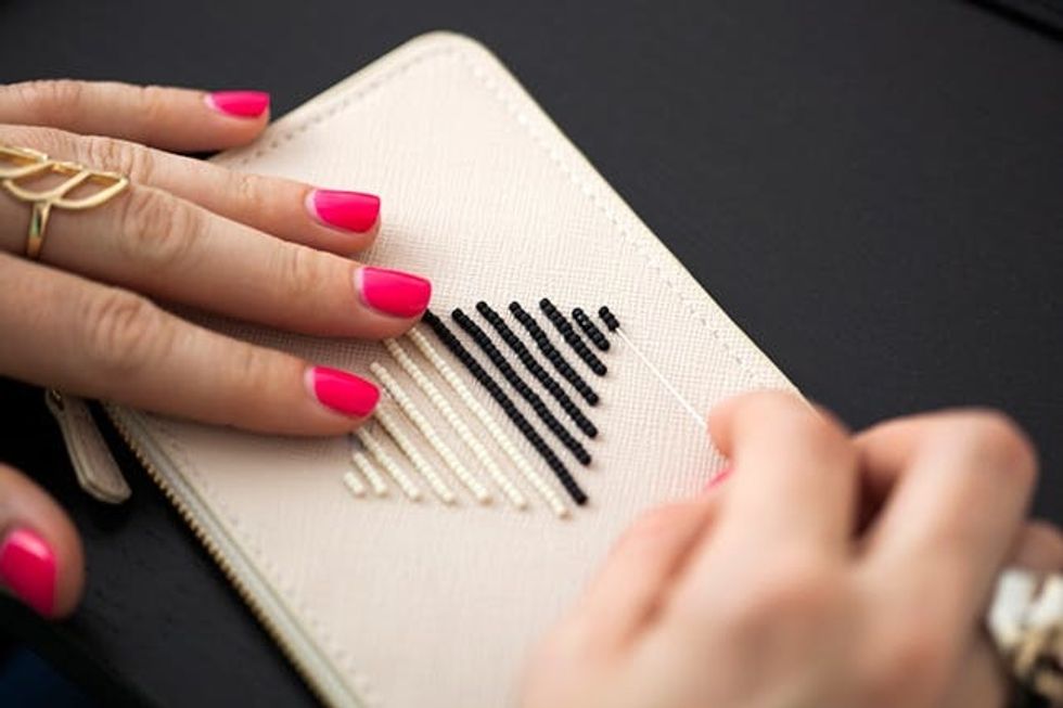 You know how much we love to put a bead on it here at Brit HQ, and we thought it was high time we made some pretty beaded wallets. These cute zippered ones are perfect for stashing your essentials. And they make it easy to swap from purse to purse. We came up with three different pattern ideas—one edgy and colorful, one simple and chic, and one that’s an ode to analog. But really the pattern and color possibilities are endless! When you’re shopping for beads, look for ones that are completely opaque—the ones that are see-through can end up looking juvenile. Let’s get started, shall we?