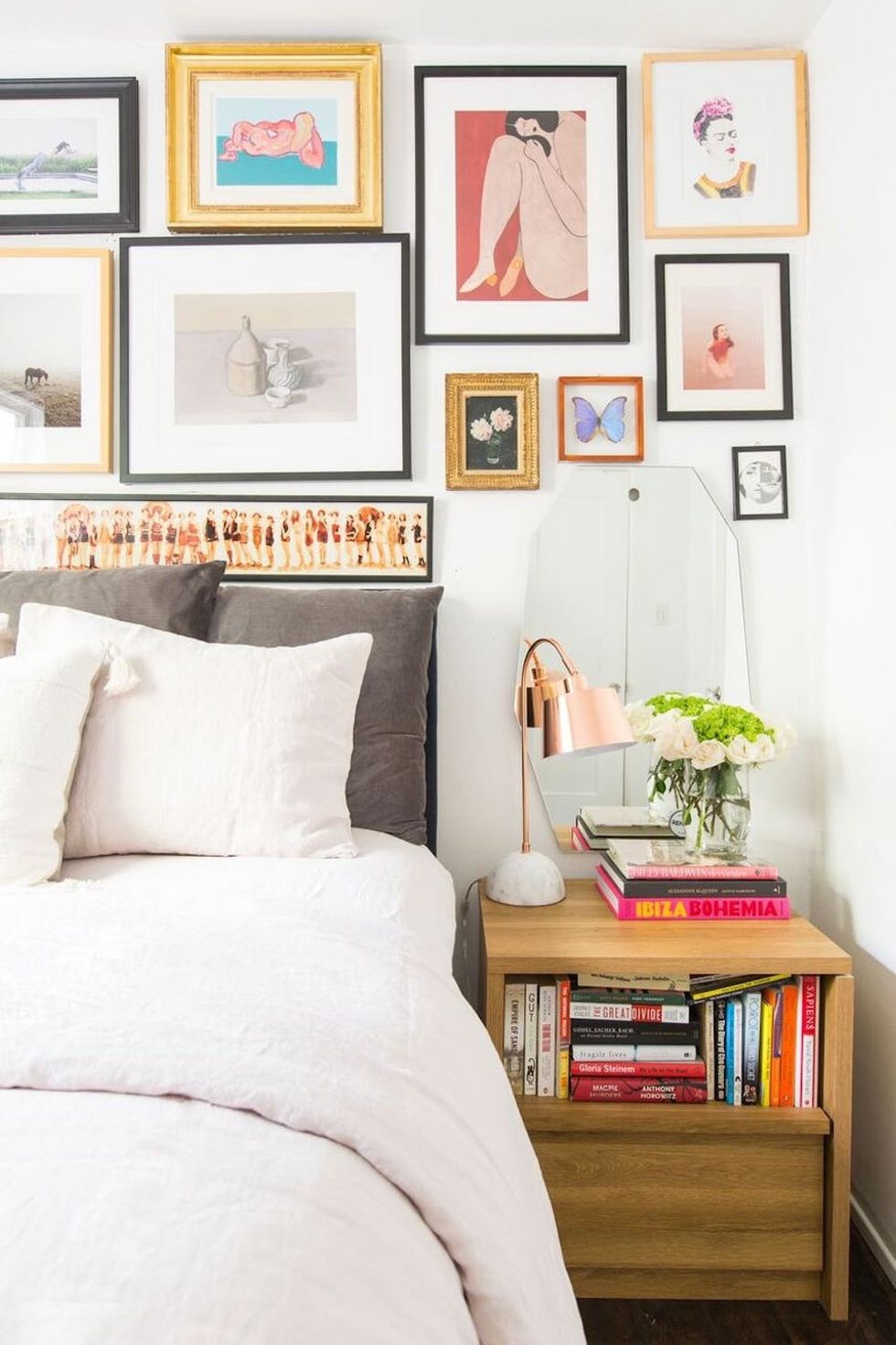 For her bedroom, Fischel-Bock wanted high style that didn’t skimp on comfort. Using the Petite Boudoir Bedroom style as her guide, she incorporated neutral linens, textured elements, and interesting accents. And the focal point of the room — the fab wall art collection — can be credited to both the app and her family heirlooms. “I’ve picked up art throughout the years from my travels and visiting local flea markets. My mom is an artist, so some personal pieces of hers are mixed in as well. I used Hutch to find the newer art, and mixed and matched styles and mediums to give the wall a collected feel,” she says.
