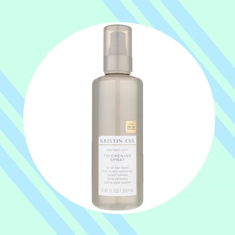 1. Kristin Ess Instant Lift Thickening Spray ($14): Sellers first amps up Kufrin’s locks with some water and thickening spray. “[I’ll use] Kristin Ess Thickening Spray all over,” she says.