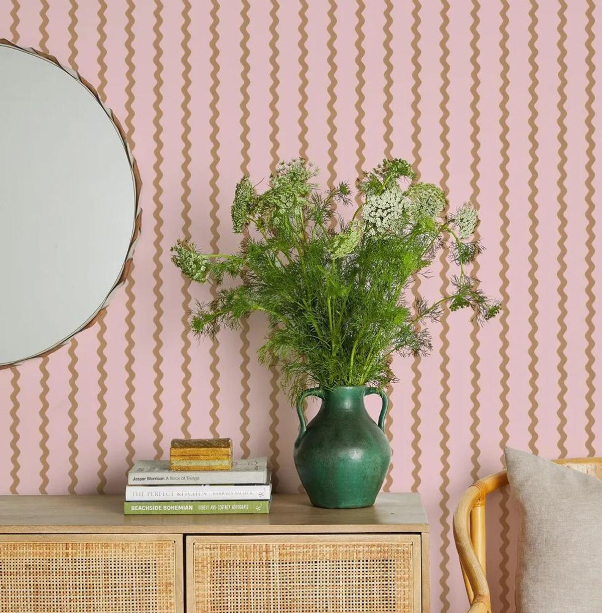 Create a colorful foundation in your bedroom by adding a pink and tan wallpaper from the SJP. Say no more.