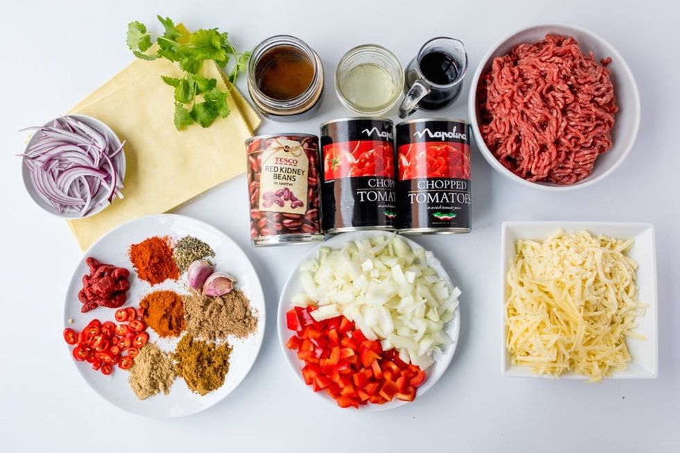 Heat up the oil in a large skillet. Add the onions and cook on medium/high for about 3-4 minutes until softened. Add in the garlic and cook for a further minute. Add in the ground beef and cook until just brown. Break any large pieces up with a wooden spoon. Add in the red peppers and cook for another minute. Add in the red wine, bring it to a bubble, and simmer for three minutes. Add in the stock, ground coriander, mixed herbs, smoked paprika, cumin, ginger, chili powder, fresh chili, and tomato paste. Stir and allow to bubble for two minutes. Add in the canned tomatoes, stir, and bring to a simmer. Let it bubble on a medium heat for five minutes, until the liquid has reduced slightly.