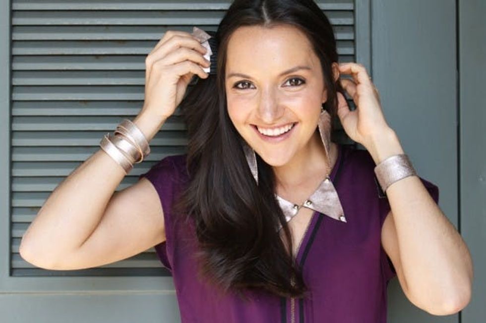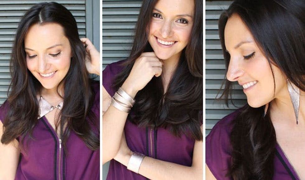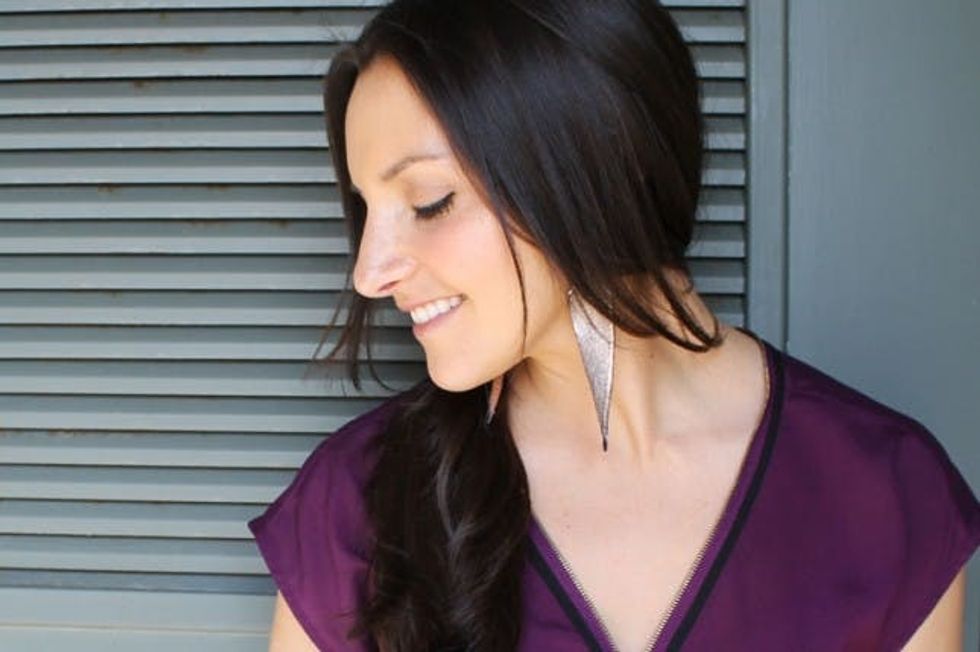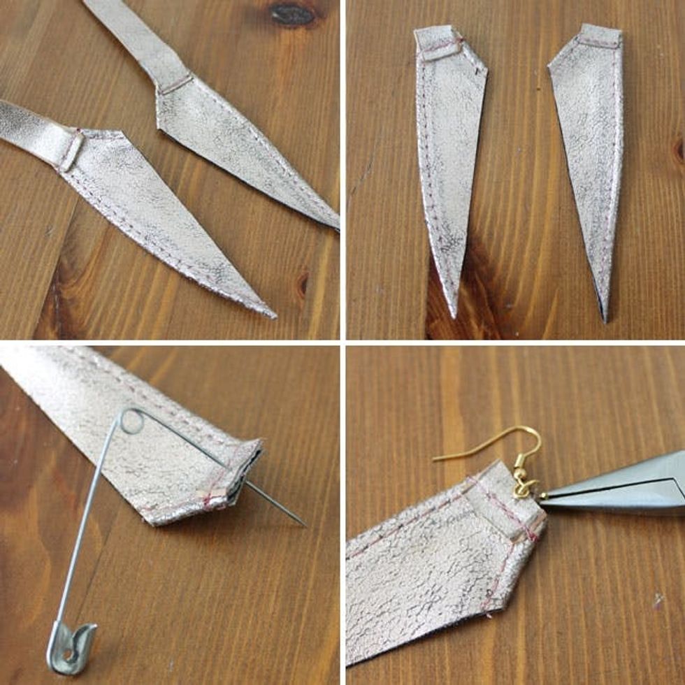 Last up, you know we love earrings inspired by feathers. Our belt happened to have the perfect little ends to make a quick and easy dangly earring. Use a safety pin to create a whole in each leather piece and then attach using needle nose pliers and jump rings. Easy peasy.