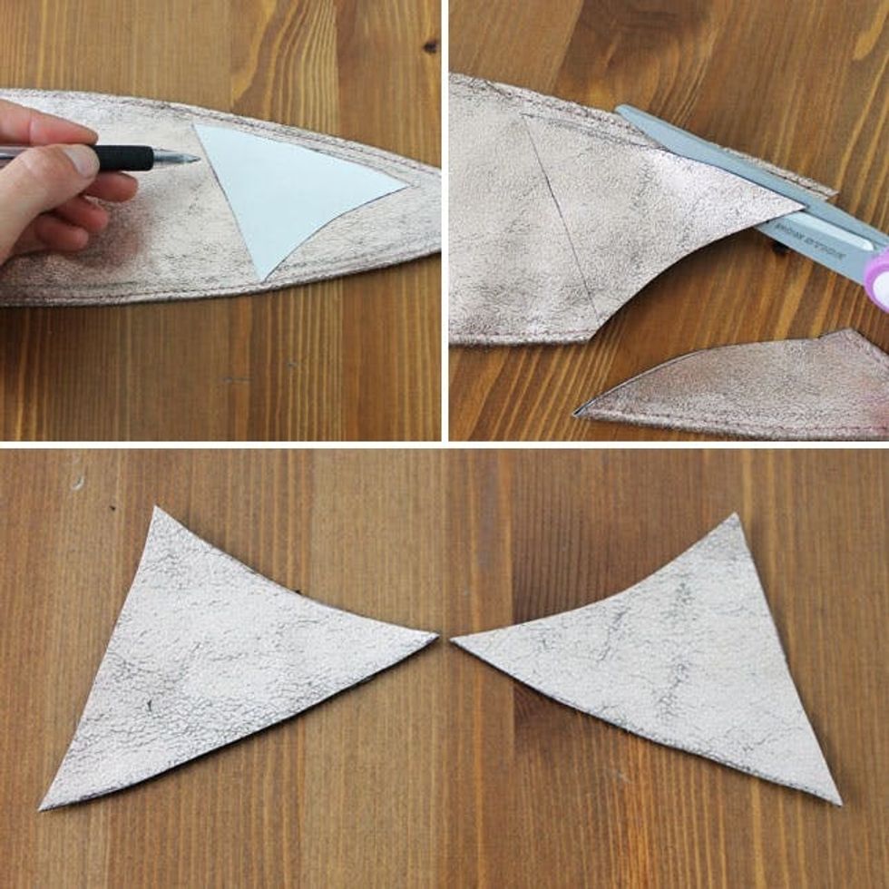 To make this, you’ll need chain, a clasp, and 3 jump rings to connect your leather pieces. Create a triangular stencil and trace it onto your leather. Cut out two of the same piece.