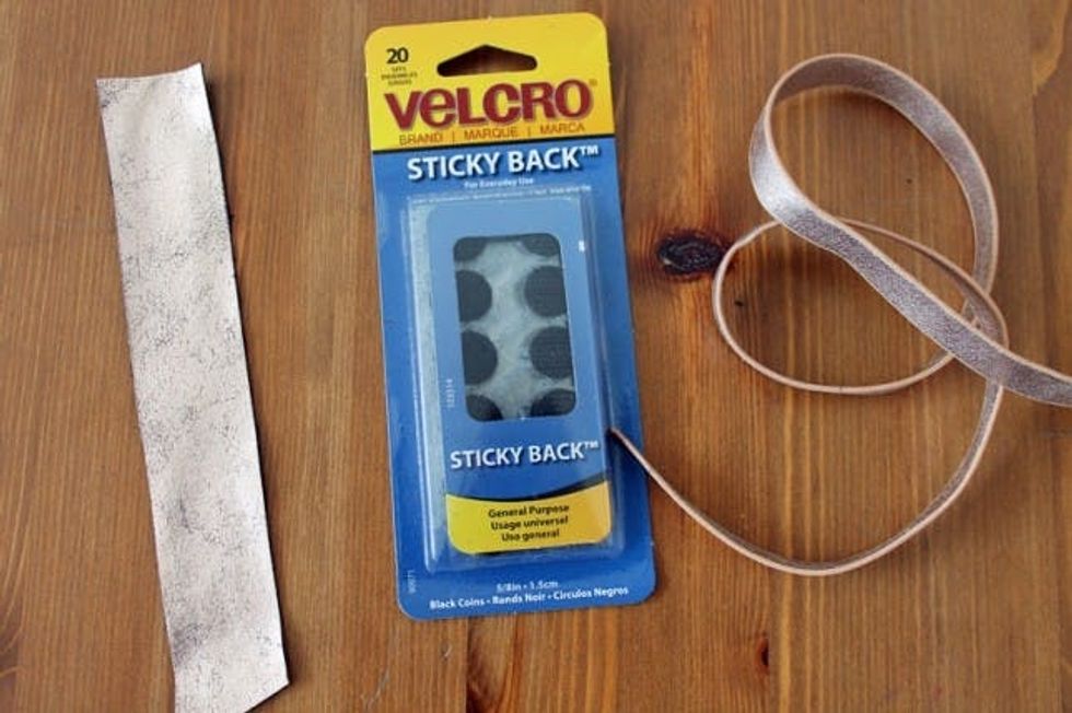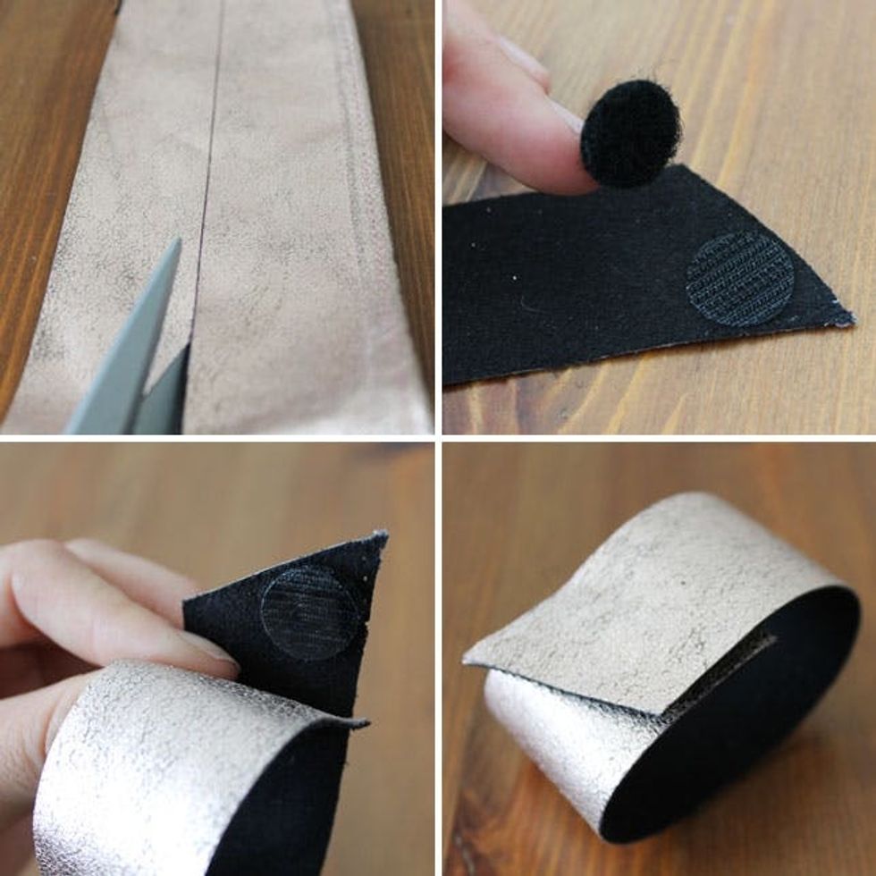For the cuff, cut a piece of the belt 2 inches wide. Angle it at each end and attach using VELCRO® Brand Sticky Back Black Coins. So easy!
