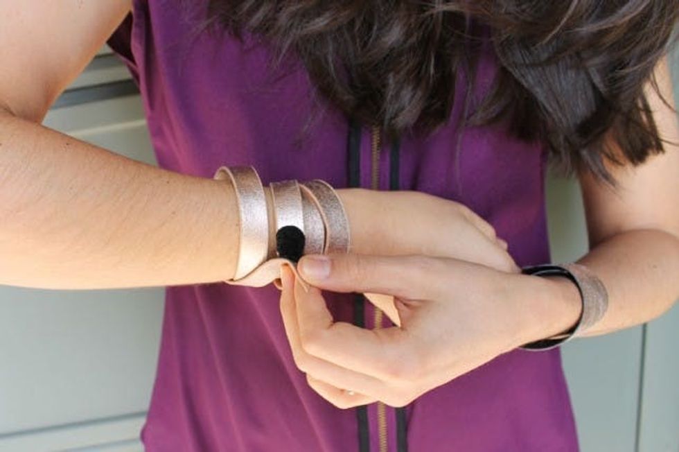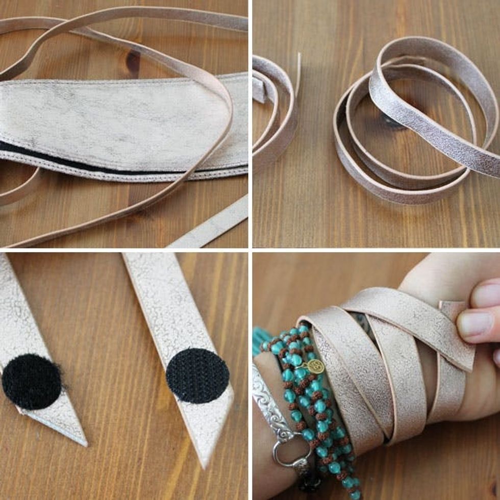 Now it’s time to become a… wrap star! We’ve made wrap bracelets before, but we’re loving the sleek look of this leather one. Use the skinny ends of your belt, wrap around your wrist, and clasp with VELCRO® Brand Sticky Back Black Coins.