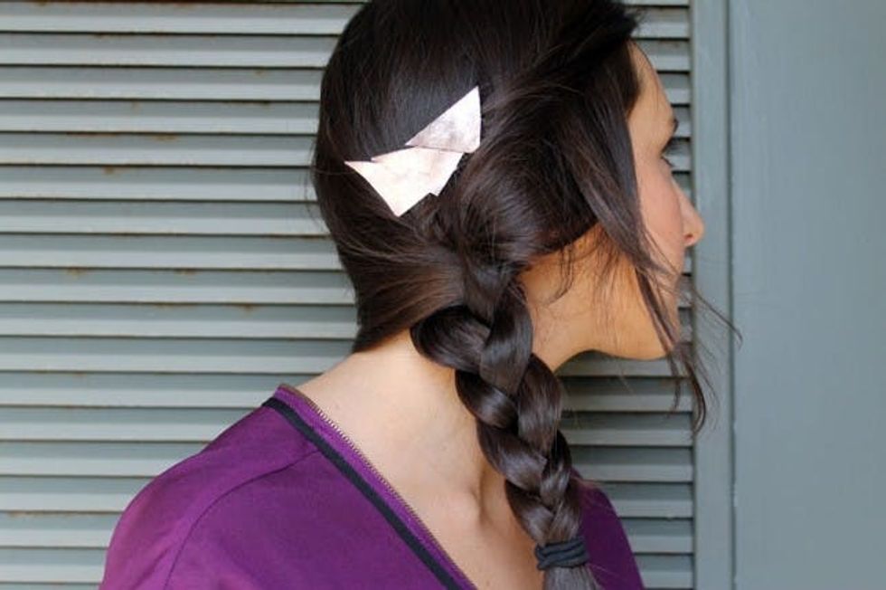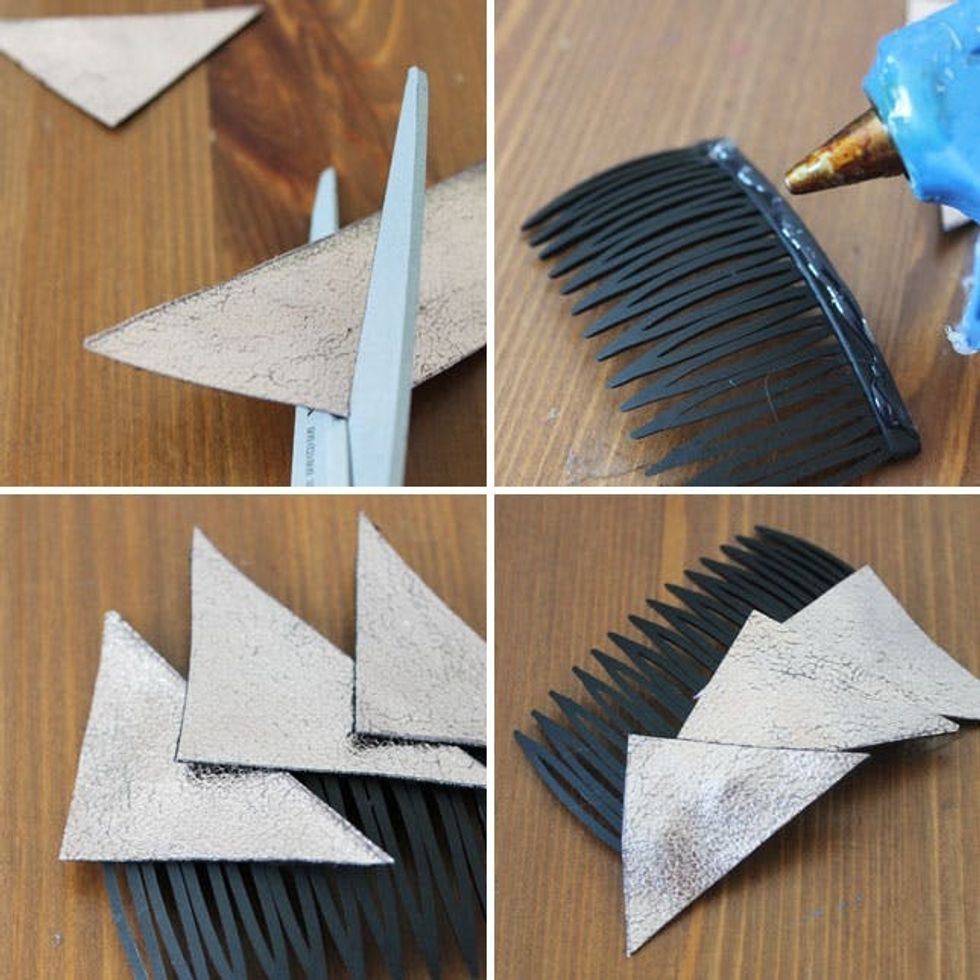 Next up, a little leather for your do. If you recall our recent tutorial on DIY side combs, you know just how simple it is to make something like this. Simply cut a bunch of triangles, glue them into a comb, and you’re done.
