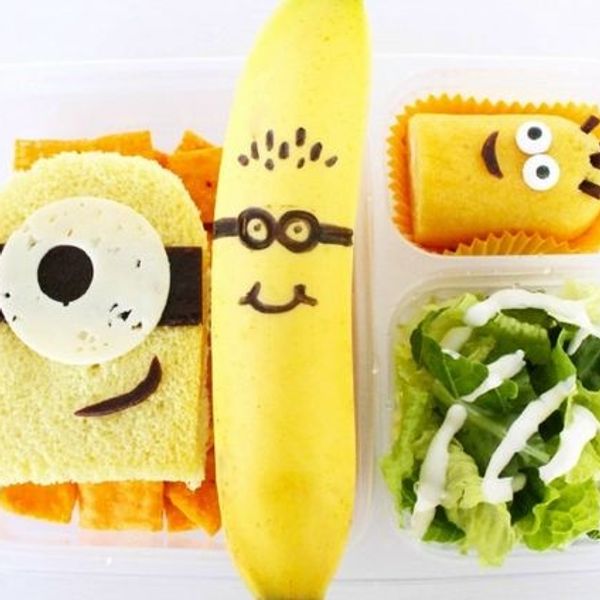 You can draw right on the banana peel and make the rest of the minion pieces with grape fruit leather, cheese and candy googly eyes. (via Foodtastic Mom)