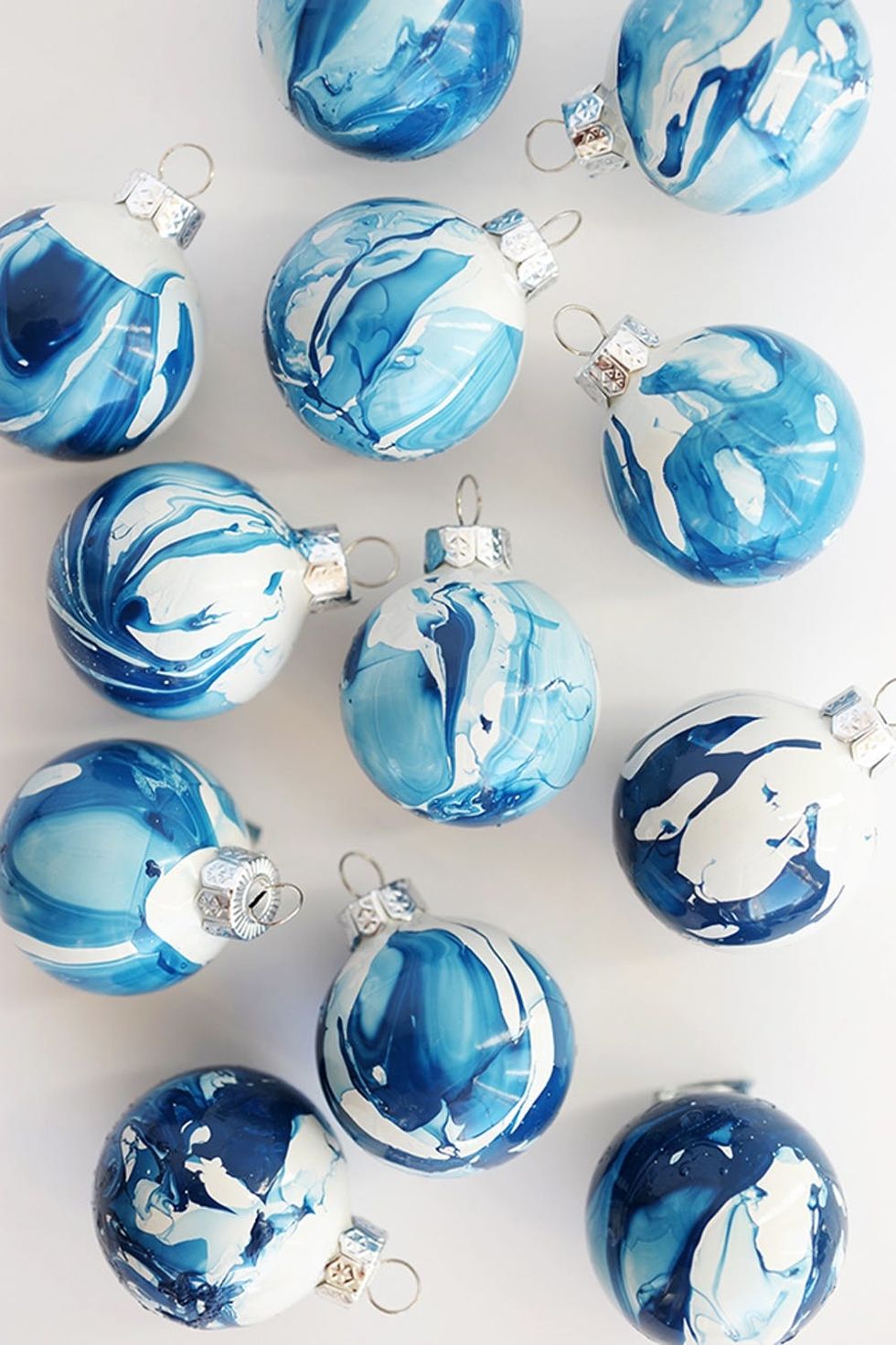 7. Marbleized Ornaments: Each swirl of paint creates a unique marbleized pattern that’s perfect for gifting or serving as a new fancy add-on to your own tree. Use paint or try melted crayons, depending on what’s floating around in your crafting closet. (via Alice & Lois)