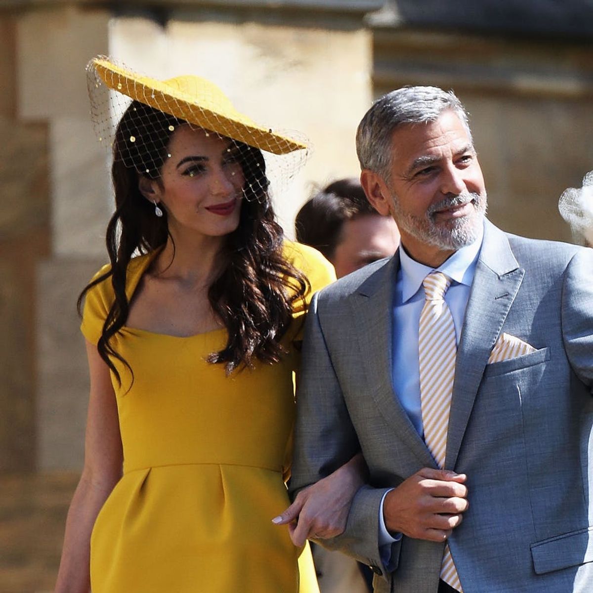 Amal and George Clooney: Amal stood out from the crowd in a sunny fitted Stella McCartney frock with a matching veiled fascinator. (Photo via Ian West/ WPA Pool/Getty)