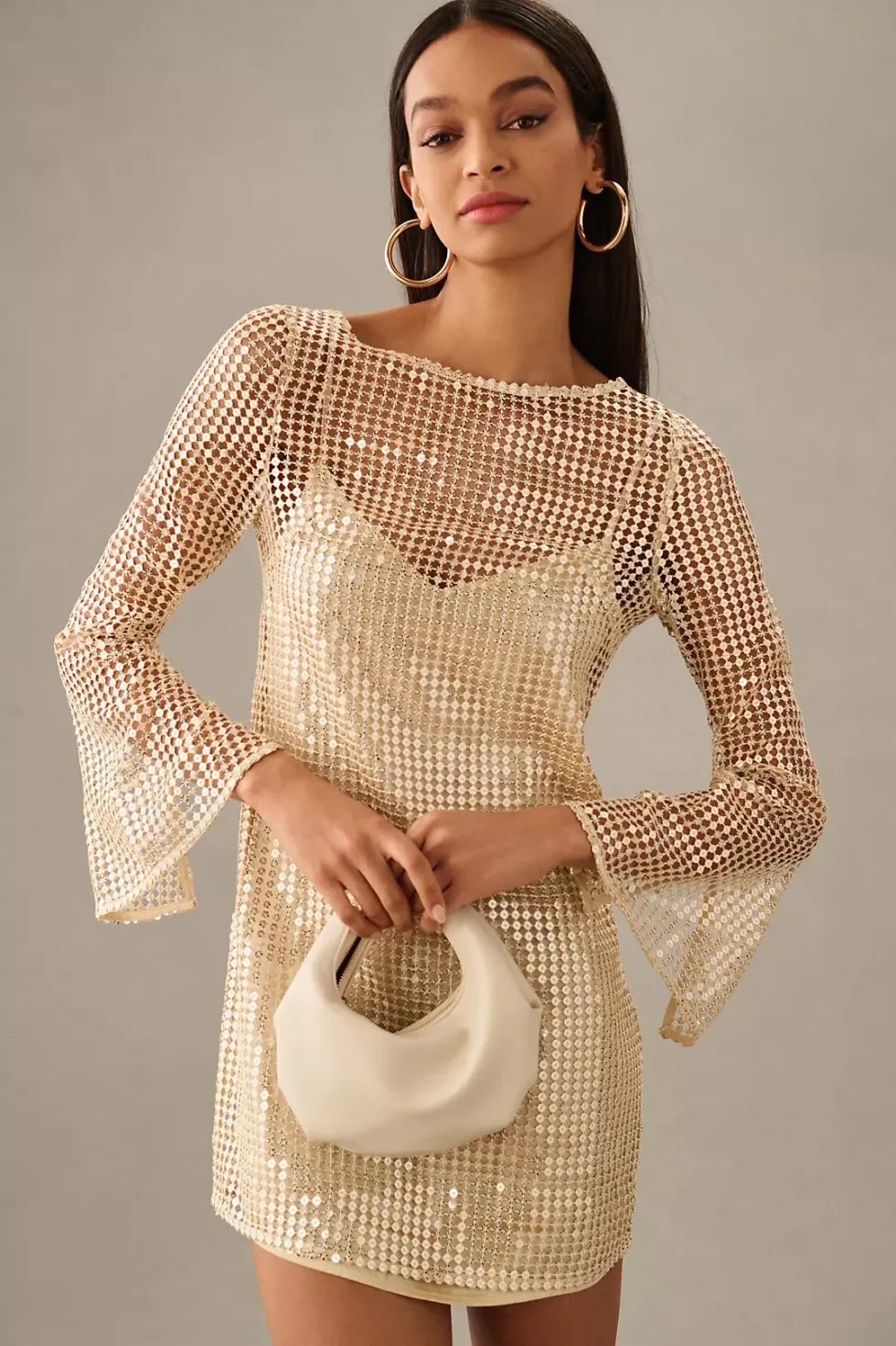 It's all sparkles and shine with this 70s bell sleeve mini. This dress may seem similar to her Fearless era at first glance, but it's absolutely giving Taylor's 2022 Toronto Film Festival look. We love how the open back adds maturity and makes it a great sleeved summer option.
