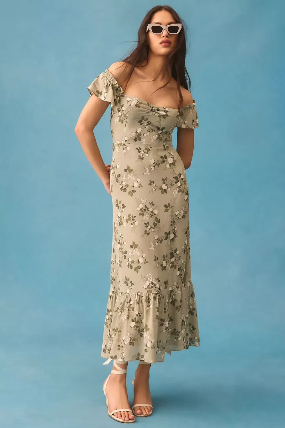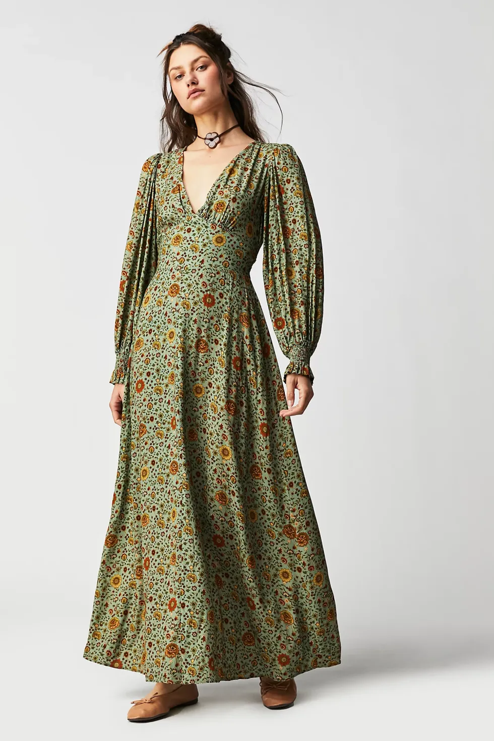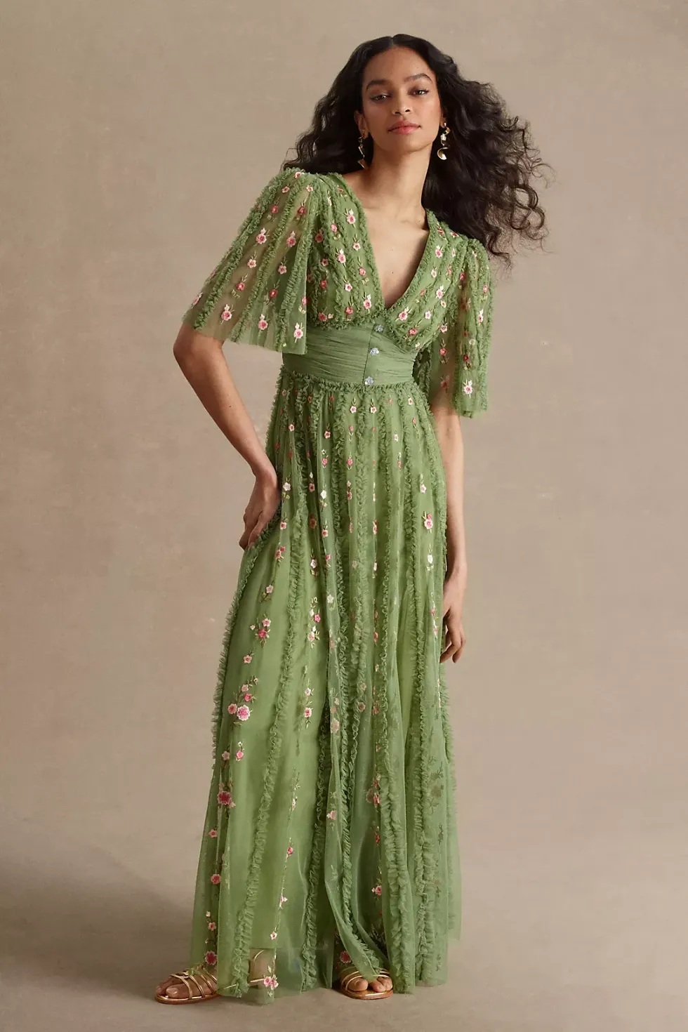 This flowing V-neck gown is gardencore at it's finest. Complete the aesthetic with a basket bag and woven flats.