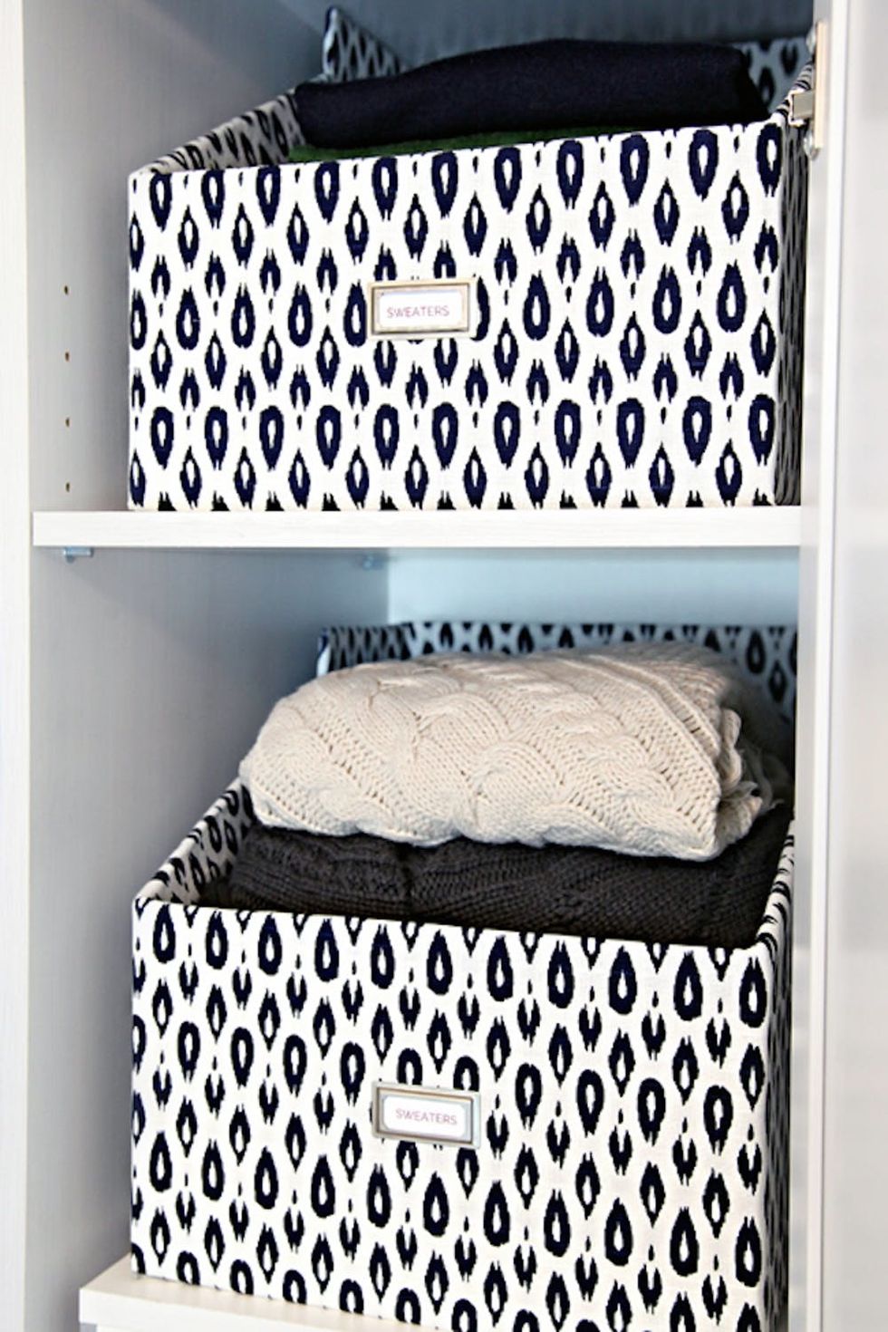 4. Curate your own sweater storage. These adorable DIY boxes fit snugly in your built-ins and keep knits out of view so they don’t look like a big ol’ mess. The fabric can be tailored to whatever pattern works best with the rest of your decor. (via I Heart Organizing)