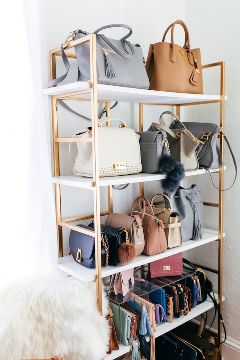 5. Put purses on display. Placing purses in different styles, colors, and materials on shelves keeps accessories in check and doubles as an incredibly cool-looking showcase. (via Haute off the Rack)