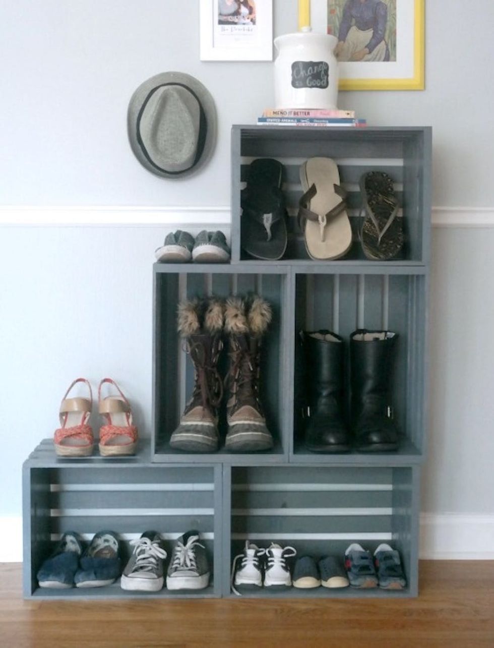 11. Make way for boots. Instead of throwing those clunky shoes and boots in an unruly pile, consider crate storage for an easy and affordable way to arrange them. The best part? This craft can be completely customized to your current selection. (via C.R.A.F.T.)