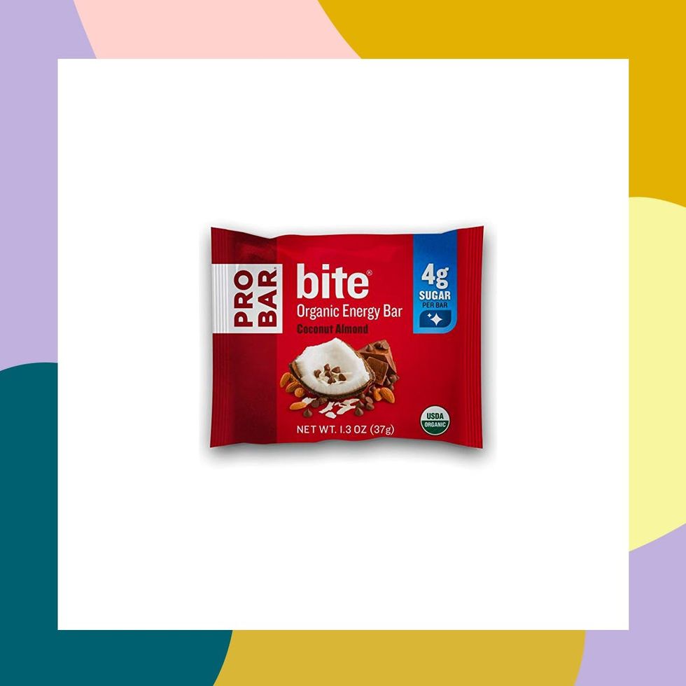 ProBar Bite Organic Energy Bar Coconut Almond ($17 for 12): We love the tiny size and tinier sugar content (4 grams) of these snack-sized bars. They’re ideal for throwing in your purse for those gym-to-work or work-to-event moments where you don’t have a break but are borderline *hangry.* Tapioca syrup glues the oats, almonds, and brown rice protein together for a mildly sweet, semi-crunchy bar.