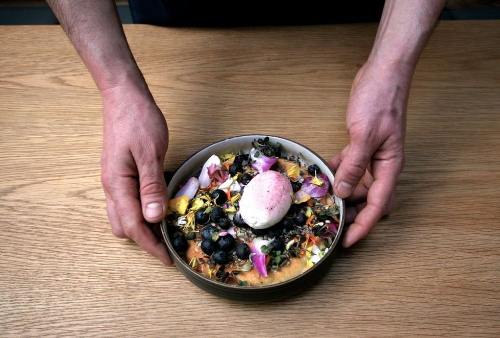 - Serve the hotcakes with maple syrup, seed mixture, blueberries, whipped cream, edible flowers, and fresh mint leaves.