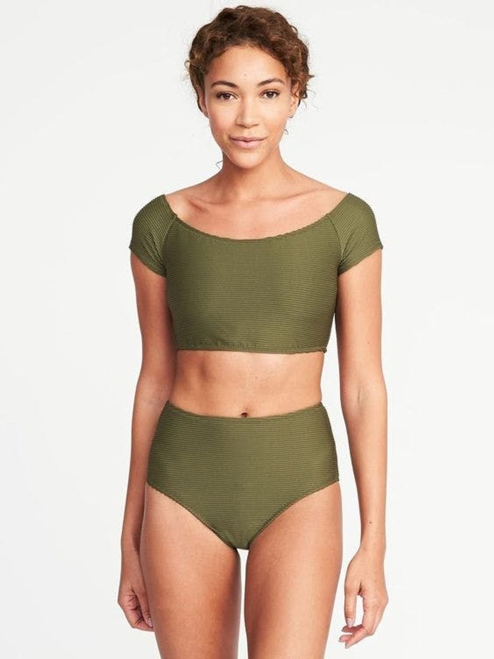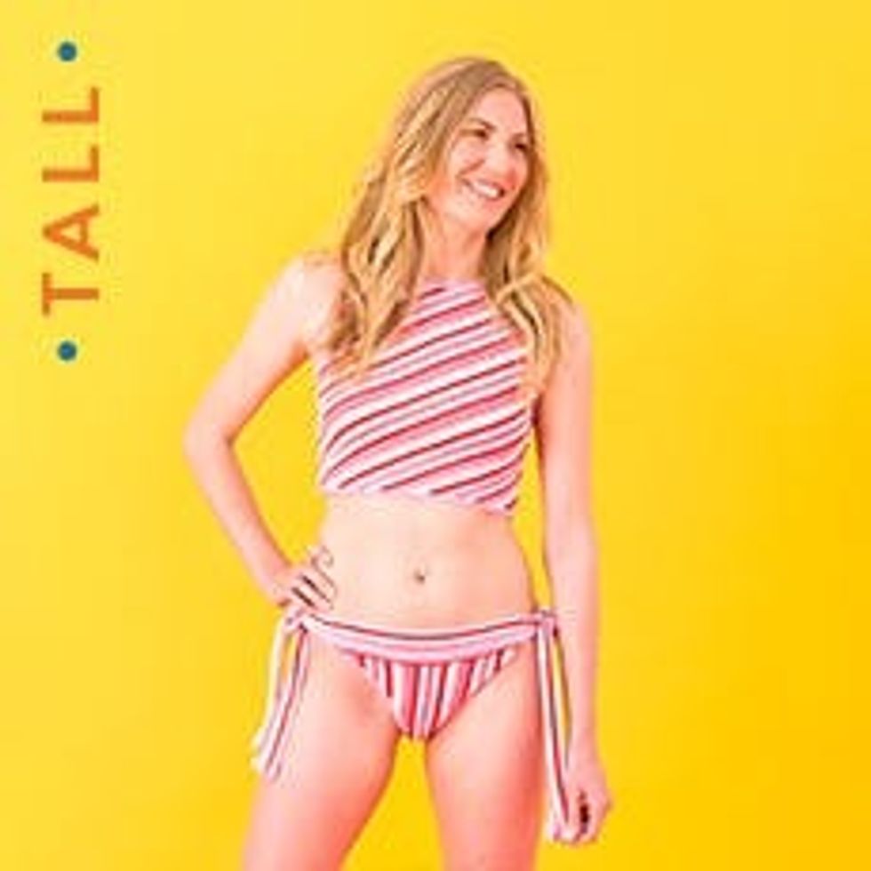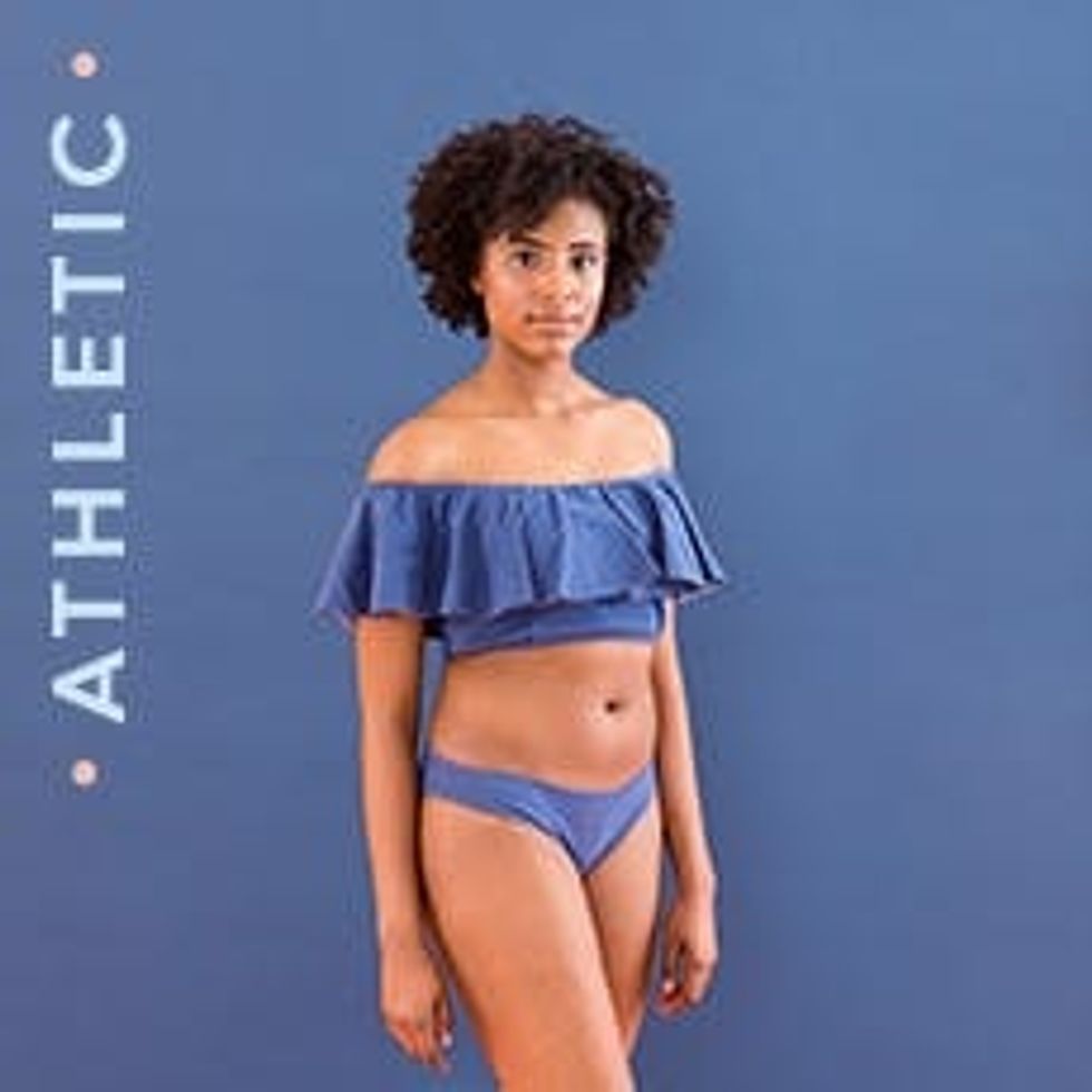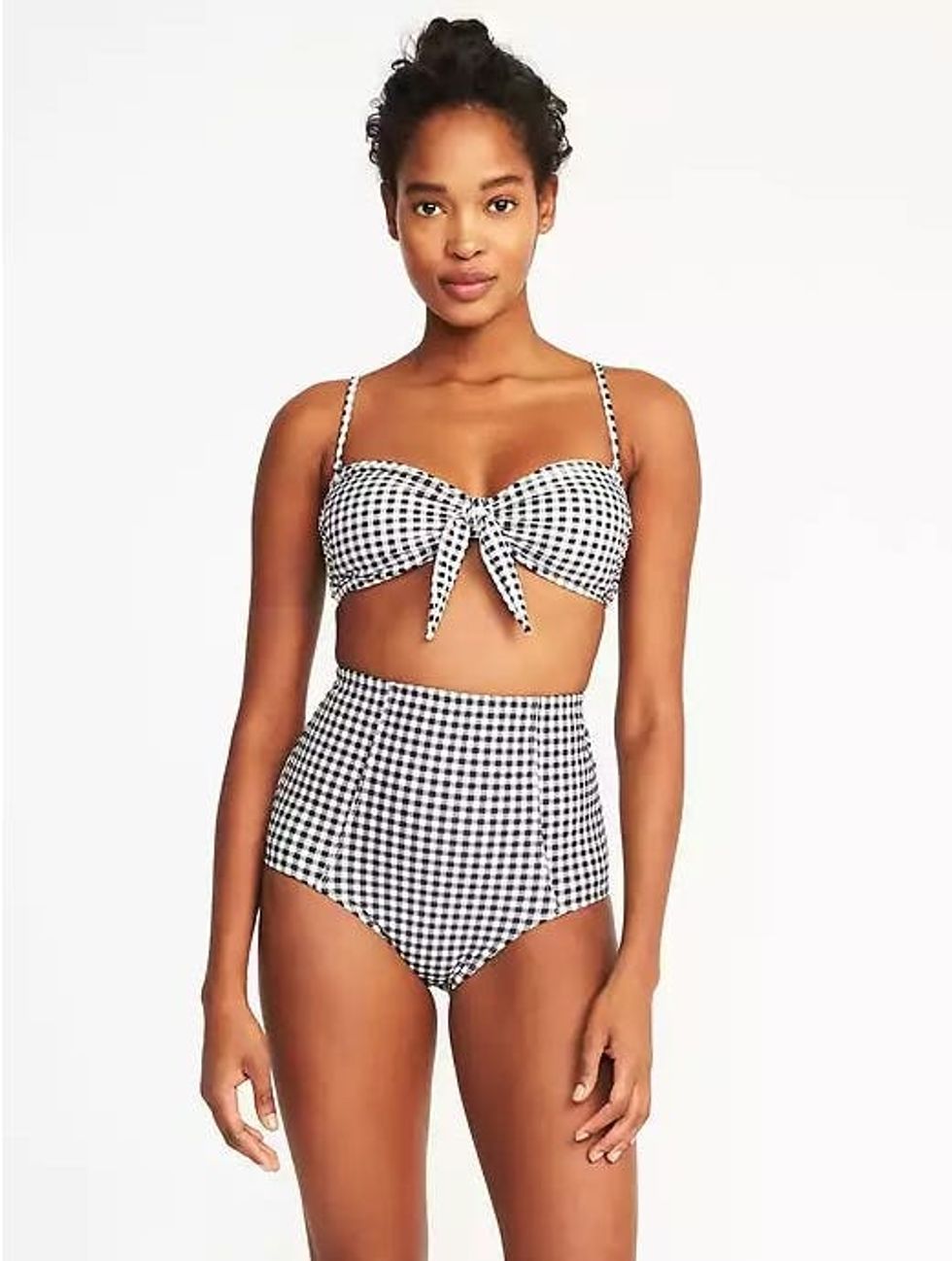 Ladies who are built straight up and down should turn to cuts and shapes that create definition at the waist, like high-waisted bottoms paired with an underwire top for added structure. But if you're a member of the itty bitty titty committee (no shame in that game), reach for textured tops that bring a bit of intrigue to your upper half (e.g. bandeau bikinis with halter strings or triangle tops with ruffles).