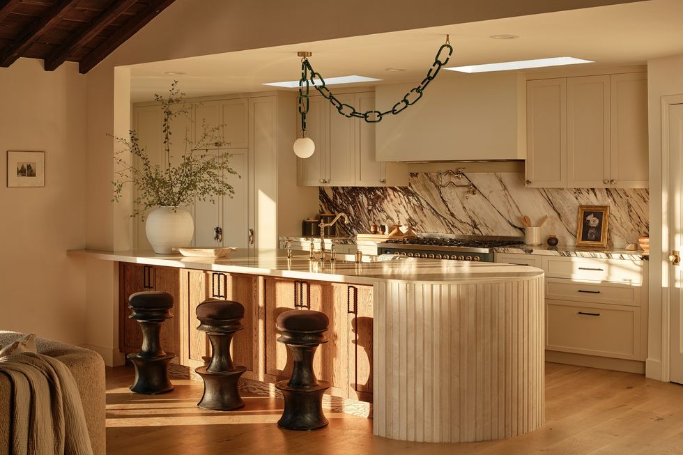 This green on green is spectacular. Bathrooms are drenched in marble, and architectural details throughout give the home a luxury vibe while still feeling not too fussy and precious. "It's less uptight than contemporary but still playful and bold," says Hahn. Moody vignettes throughout add personality and uniqueness too.