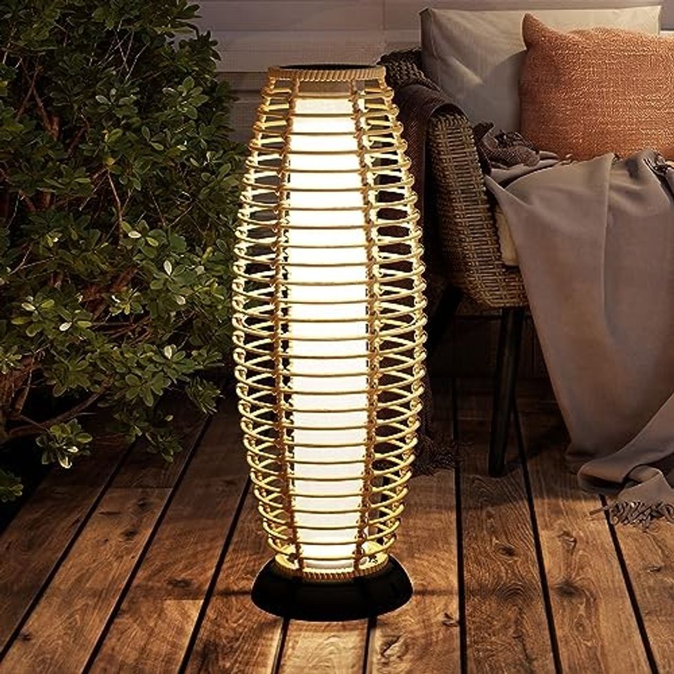 See it on AmazonLight Up Your Patio with the Outdoor Solar-Powered Woven Resin Wicker Lantern Floor Lamp