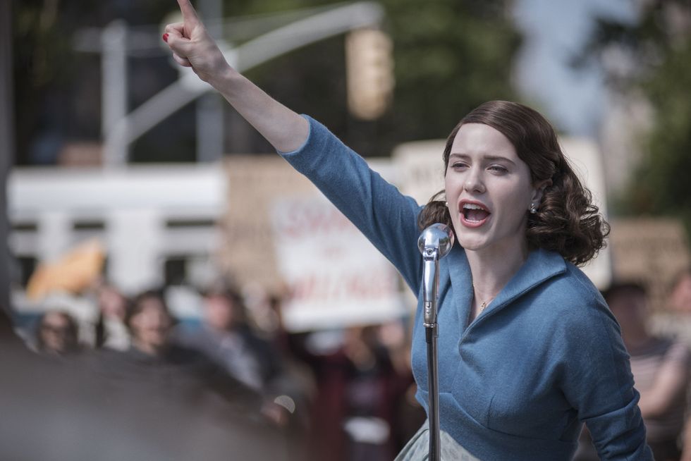 It gives women a voice in an era when they didn't always have one: Midcentury women were largely expected to tend to the home, the children, and their husbands, and while Midge fulfills those expectations, she also creates a life for herself outside of her apartment. She has a distinct point of view, and she's not shy about sharing it, whether she's on stage at a comedy club, charming guests at a party, or giving a rousing speech to protesters at Washington Square Park. (Photo via Amazon Prime Video)