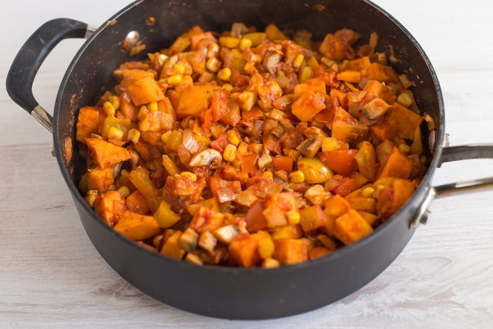 Add the diced mushrooms, tomatoes, pepper, and corn, along with the spices and tomato puree. Mix well, and continue to cook for a further 5-10 minutes, until the vegetables are all fairly soft.