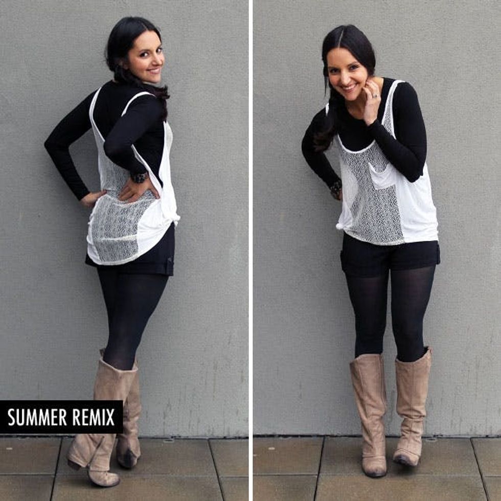 3. Summer Remix: Breathe some wintry life into your favorite summer clothes by layered them over your winter wear. You can think of your black long sleeve shirt and black tights as a chic version of long underwear.