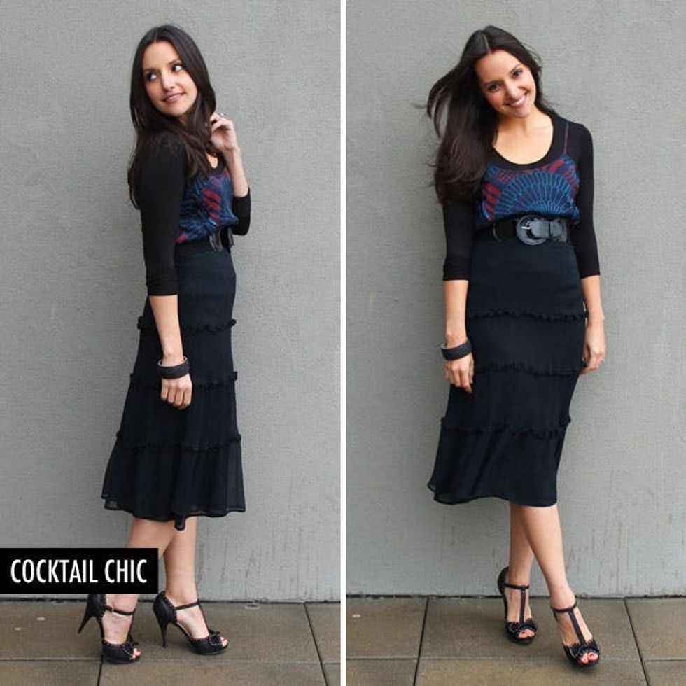 4. Cocktail Chic: Gotta have a cocktail look. This has a decidedly spanish look, with the ruffly skirt, bold patterned blouse, and heels that are just begging to samba.
