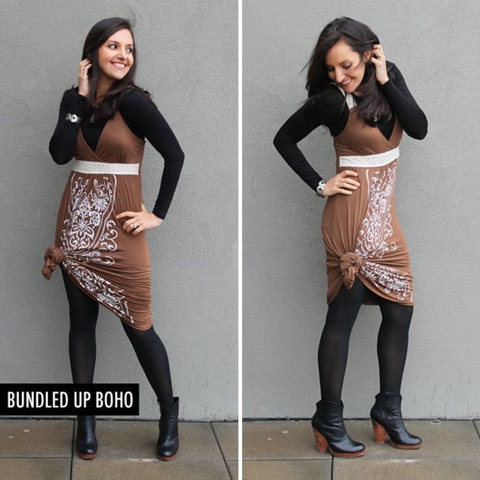 6. Bundled Up Boho: Can’t bear to part with your hippie-fied maxi dress from summer and fall? Layer it up! Add a knot to the bottom to give it an edgier more playful look.