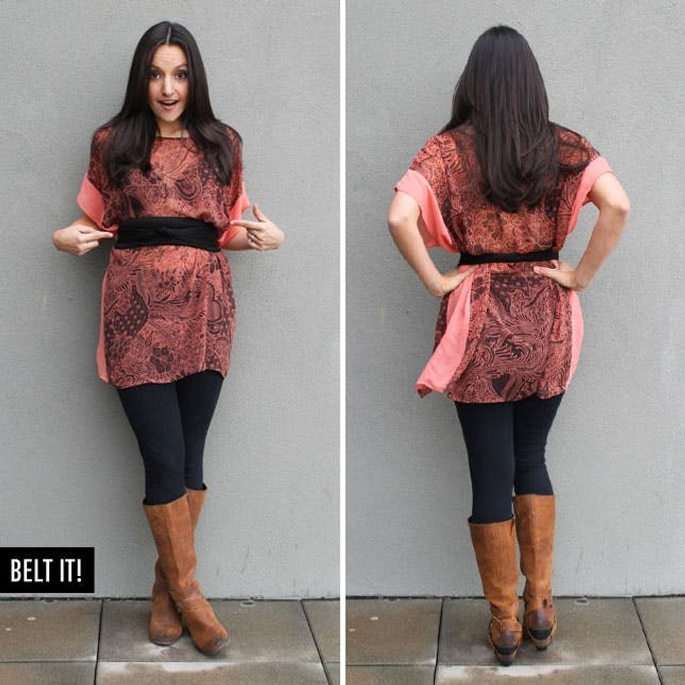 8. Belt It! That’s right, we turned our long sleeve into a belt. Roll it up, wrap it around, and use the sleeves to create a knot at the front. A great solution if you’re packing light.