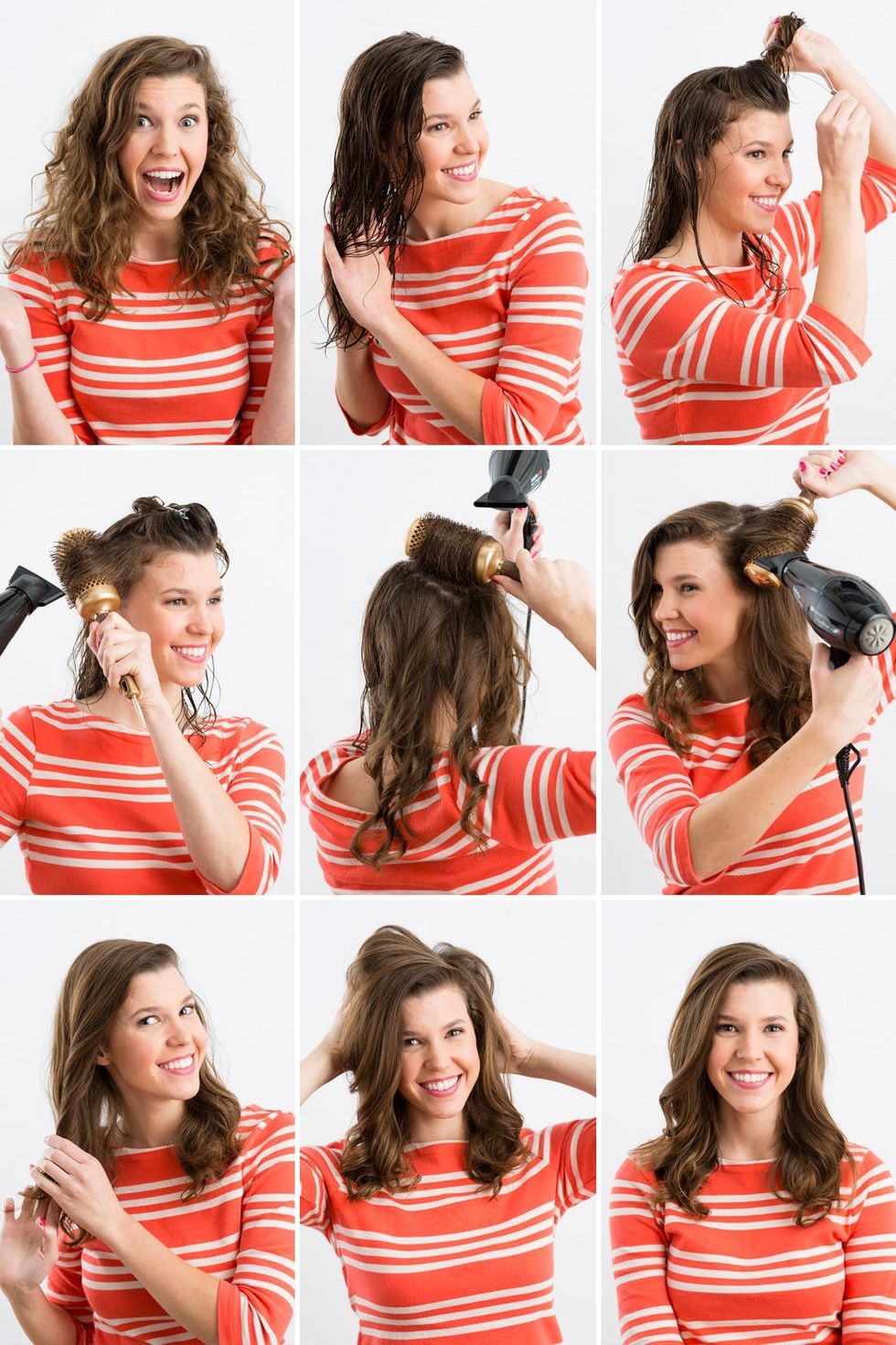 3. Use the round brush and flat nozzle on your blow dryer to smooth the curls down. Once the section of hair is feeling dry, use the brush to twist the hair around in the direction you want the curl to go in and gently pull the brush out leaving the section twisted.