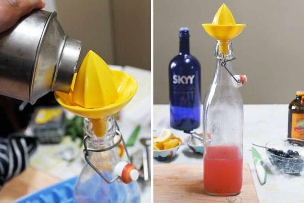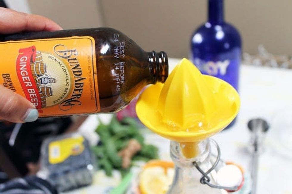 To pour into our bottle, we used this lemon juice funnel because we couldn’t find our regular funnel! Add lemon slices, blueberries, and mint to the bottle. Repeat with another shaker. At this point, you’ve got a nice fruity vodka mix. You can store this in the fridge if you’re not quite ready to serve drinks, or you can go ahead and add the ginger beer.