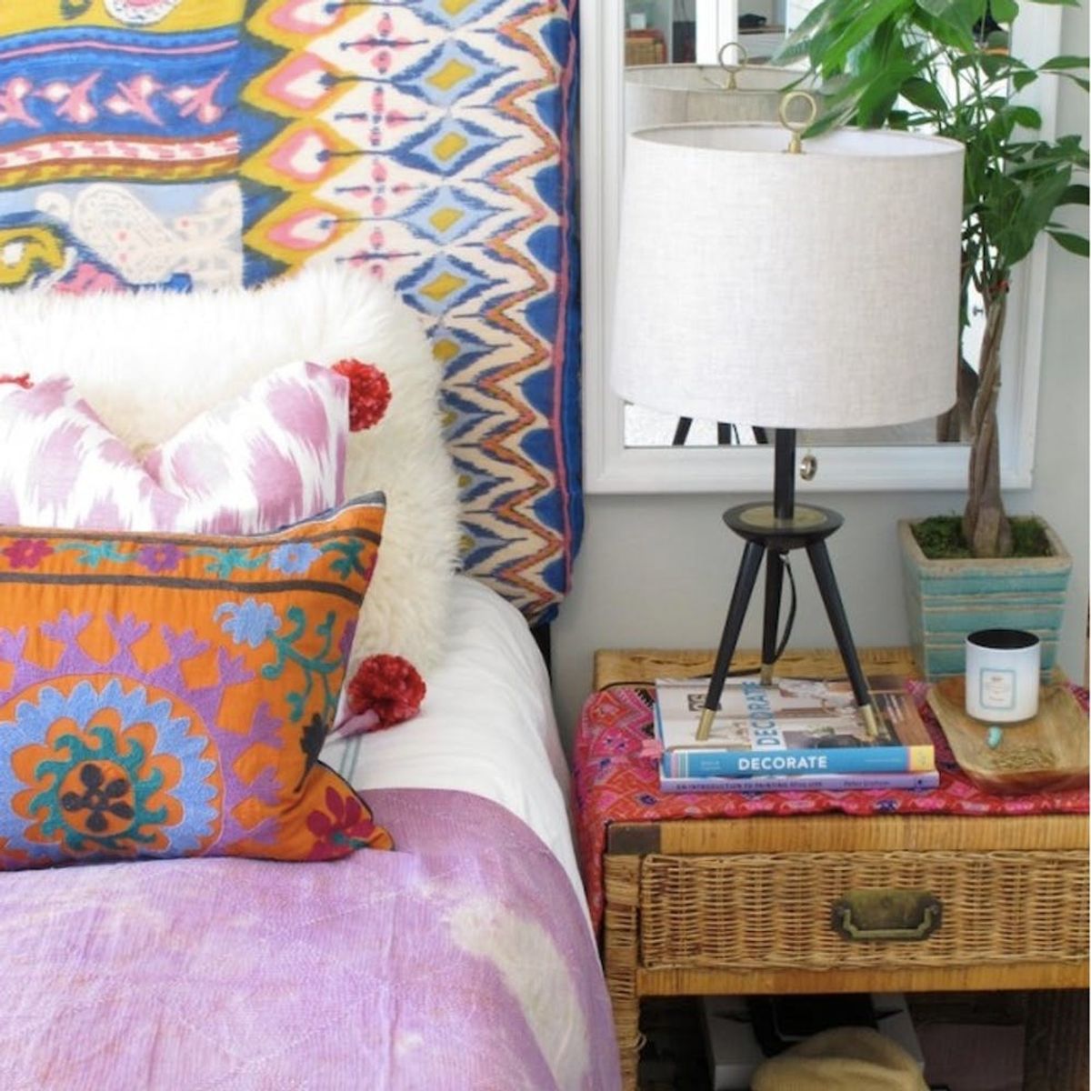 2. Lots of Color: An abundance of color is essential for any boho boudoir. In this space, a mix of patterned pillows and linens sets the tone for the space. The wicker end table adds an essential dose of texture, but feels modern with its squared-off edges and a drum lamp shade on top. (via Stories By Stella)