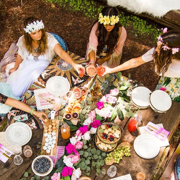 Gone are the days of stuffy bridal showers in your partner-to-be’s great-aunt’s living room. As much as we love sitting on couches covered in plastic and receiving a somewhat awkward mix of kitchen appliances and lingerie, it’s time to think beyond the traditional shower. In this post, we’ll show you how to whisk your gals off to an IRL Midsummer Night’s Dream. Meet your new pre-wedding tradition: the boho bridal picnic!