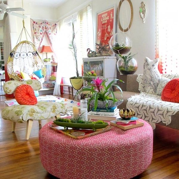 29. Hanging Seating: Cheerful and colorful, this living room’s use of vertical space, from the hanging plants to the hanging chair, is just right. (via Bohemian Vintage)