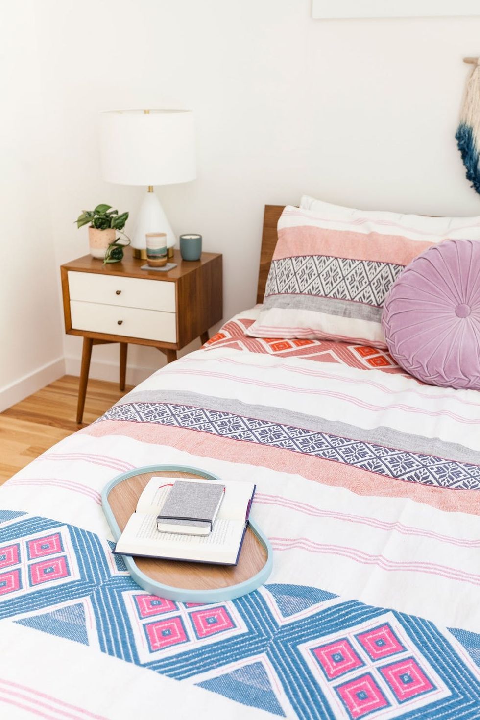 Coordinate Your Bedding with Your Wall Art: Never underestimate the power of a coordinated color palette. Once you’ve got the key furniture pieces on lock, it’s time to add unique decor accents. For this space, we wanted to keep it bright with a few bands of color. We chose the bedding first and then selected art pieces to match.