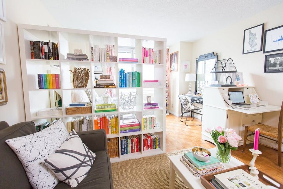 If you’ve ever lived in a studio apartment, you know that defining different spaces is key. (Otherwise, you end up with work papers on your bed and your laptop perched next to the kitchen sink, and it’s not good for productivity or your sleep cycle.) But with space at such a premium, it’s not always easy to create separate areas without overcrowding an already-cluttered apartment. Enter the bookshelf hack. Using open shelving units to carve out space is our all-time favorite tip for studio living. Not only does it give you tons of storage space, but it offers a lot more flexibility when it comes to the layout of your studio. Even better? Chances are you already own a shelf that will work for this project. (KALLAX, we’ll never leave you.) And best of all, all that shelving gives you SO many styling options. #Shelfie, anyone?