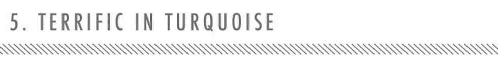 This outfit screams summer with the bright turquoise top, white leather mini (with laser cut designs!), and a comfy pair of booties. It’s also the perfect combo for a day-to-night ensemble.