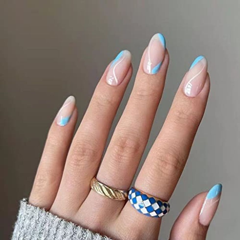 Get a chic manicure with RikView Medium Press on Nails. These French fake nails feature almond shapes with blue and white swirl designs, offering an easy and stylish acrylic look with clear press-on nails.