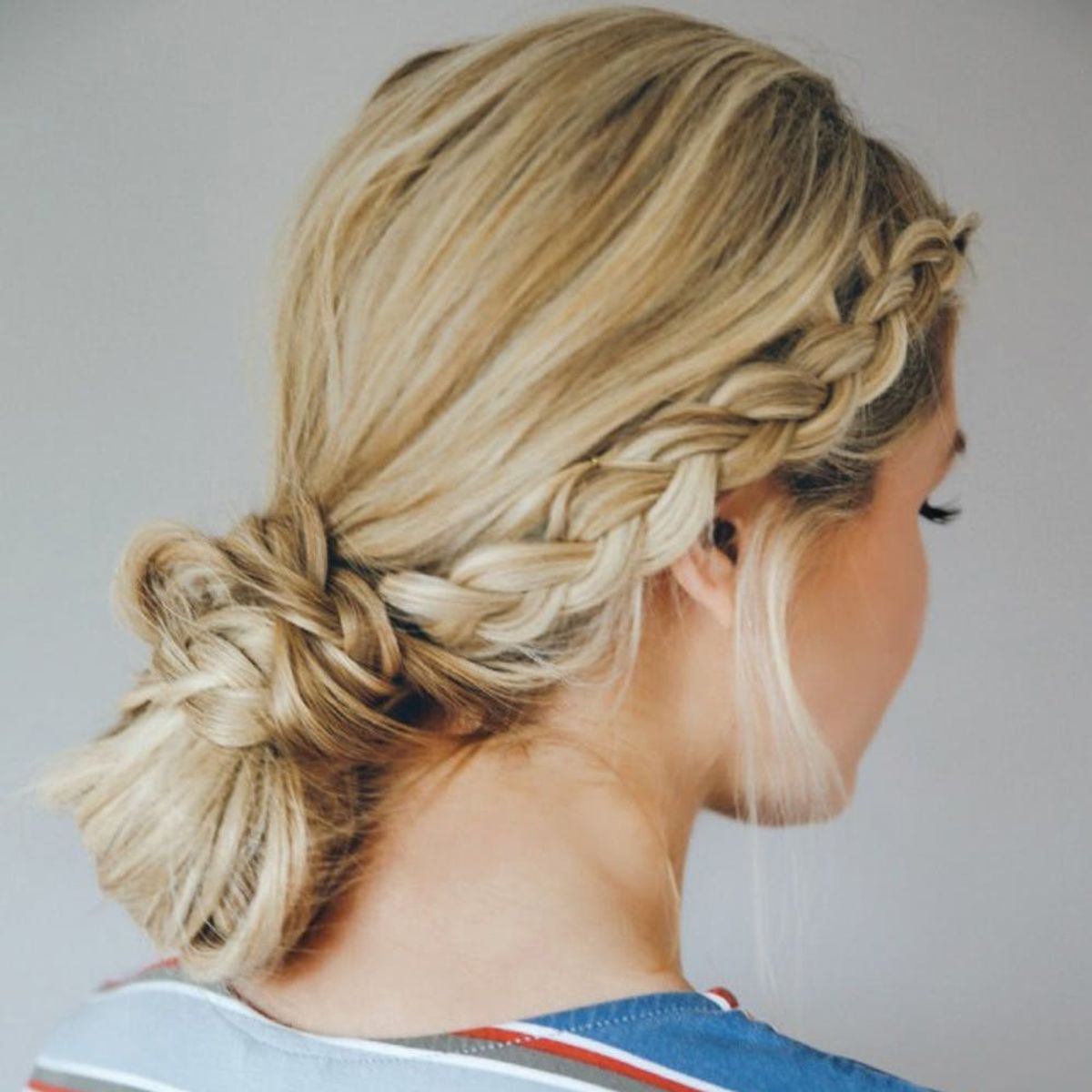 The letter “B” might be our favorite when it comes to hairstyles — because buns and braids. The two styles are clutch on their own but, better yet, blend effortlessly together, whether you wear you hair high up in a messy topknot or pulled back and down. In other words, braided buns are one of those five-minute hairstyles that fit the bill for the fanciest of events. Find the right romantic Valentine’s Day hairstyle, perfect-for-work ‘do (to finally achieve that illustrious grown-up look) or style to polish your weekend sweats with these 10 easy-to-DIY braided buns.