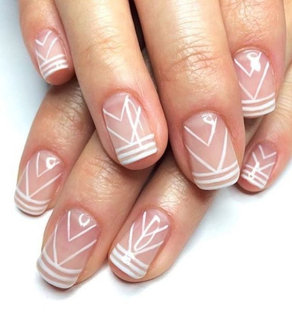Show off your bohemian side with a subtle print that doesn’t clash with your stone. Opt for delicate nail art in shades of pink and white that bring to mind weekends spent on the festival circuit. (Photo via Pinterest)