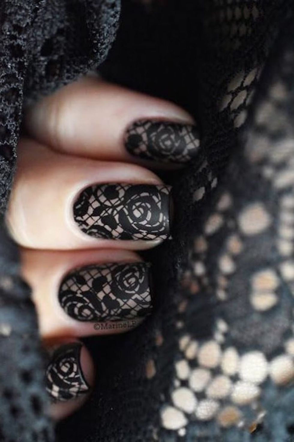 Vampy lace nails in all black? Yes, that will play quite nicely with your statement bauble. (Photo via Pinterest)