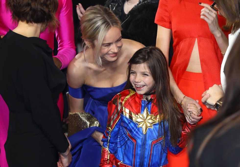 As Larson walked the blue-and-gold carpet at the London premiere on Wednesday, February 27, she met and spoke with a young girl who was decked out in her superhero best, wearing a replica of the red, blue, and gold Captain Marvel suit that Larson’s character, Carol Danvers, wears in the film.