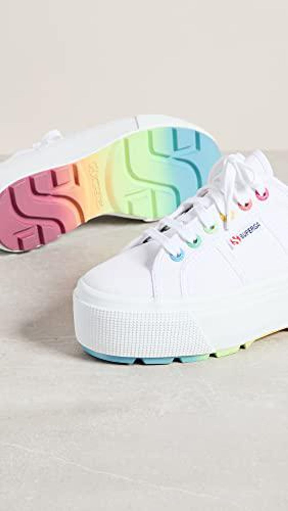 When we first saw these Superga Sneakers, we just noticed how super cute they were. The next thing we noticed was how distinctive the sole is. The sole and the grommet studs are rainbow-colored, and the sole has "Superga" on it. There can't be that many of these sneakers out there, so don't leave any footprints behind if you don't want to be tracked down!