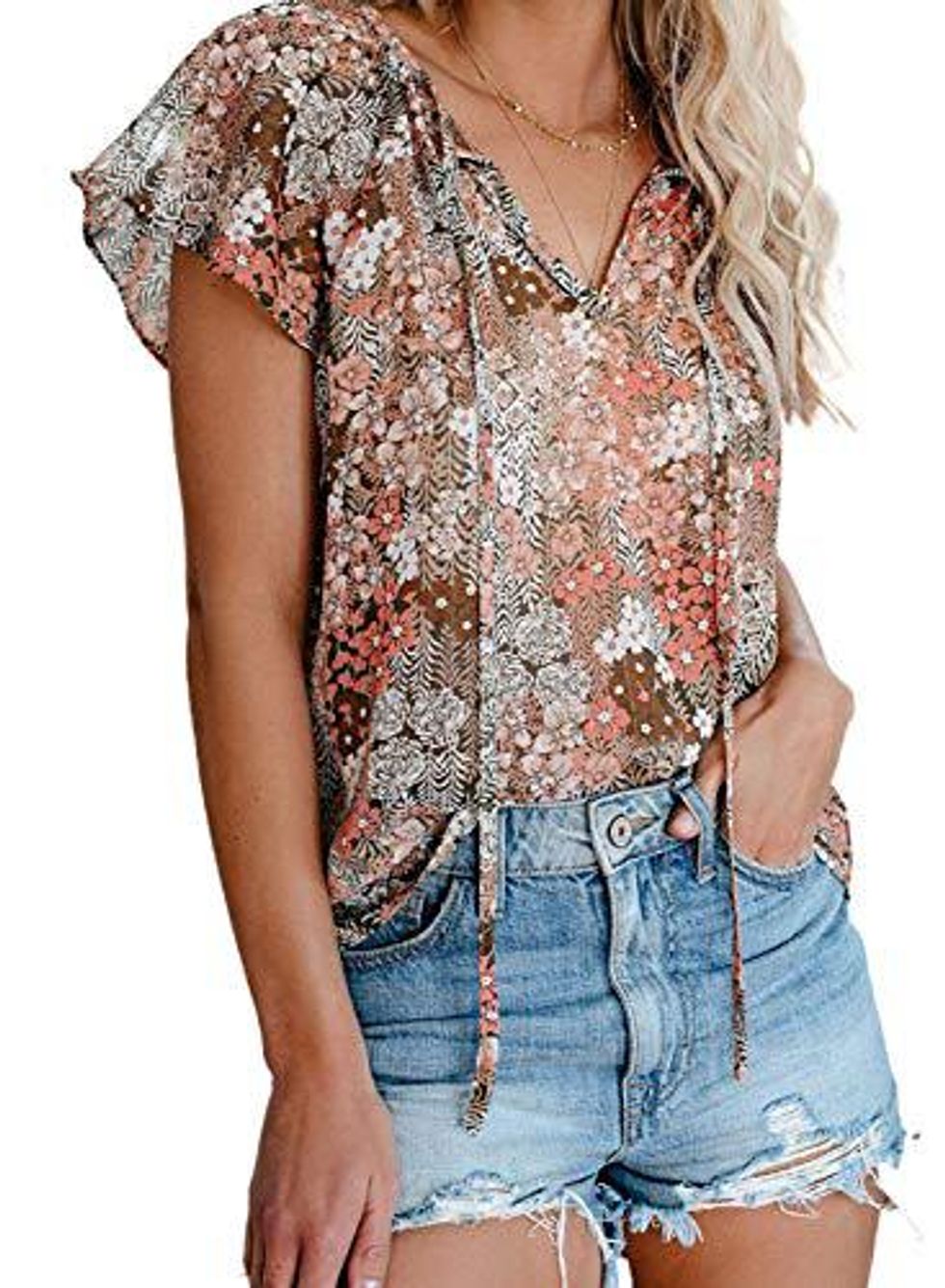 See it on AmazonThis Casual Floral Printed V Neck Drawstring Short Sleeve Tshirt