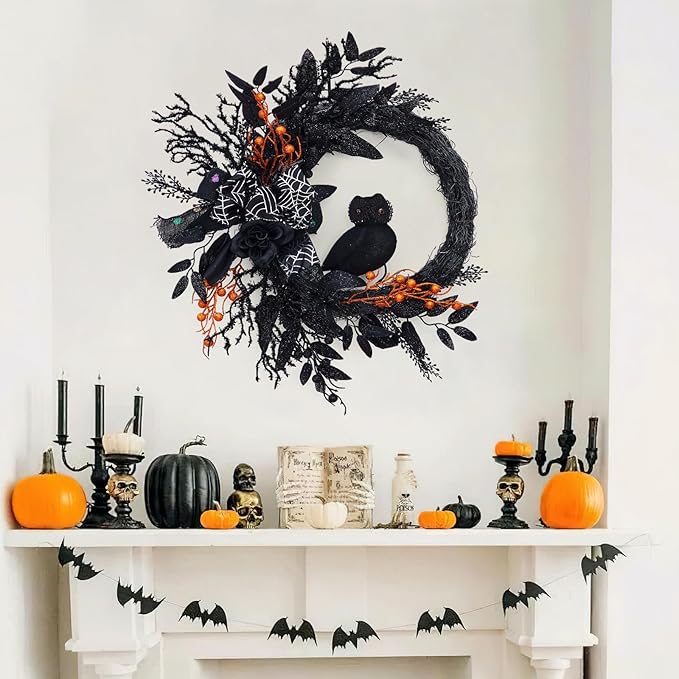 Step away from the cliché orange and elevate your space with this wreath that is covered in black roses. Plus, the perched owl detail adds subtle eeriness without going over the top.