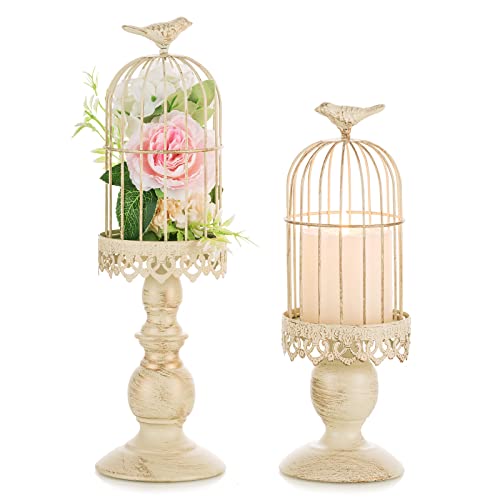 Elevate your table centerpiece or mantel with these ivory birdcage candle holders, featuring distressed metal craftsmanship and lace detailing. Perfect for pillar candles or flameless options, they add romance to weddings, holiday parties, or everyday farmhouse decor. Use them as gifts or fill with flowers and trinkets for a customizable display.
