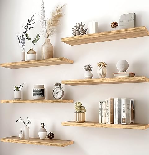Fill an empty wall with a visual display of personality when you hand these natural wood floating shelves that transform a boring living space into a dynamic scene full of your favorite things.