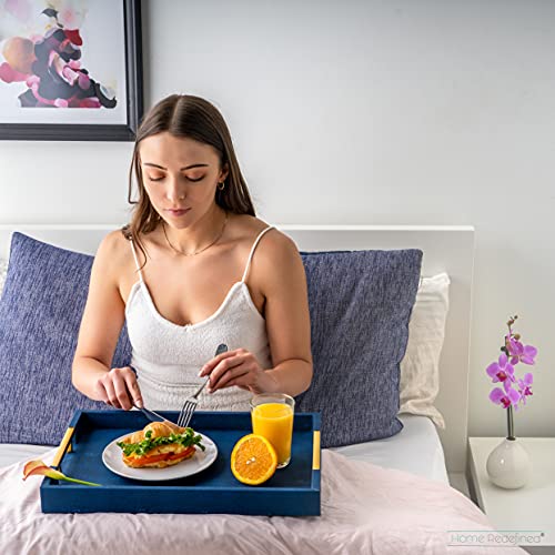 This versatile navy faux leather tray with brass-toned handles elevates everything from coffee service to bar setups. Its textured finish offers a luxe look, while the sturdy construction makes it suitable for daily use. Place it on an ottoman, countertop, or dresser for instant organization.