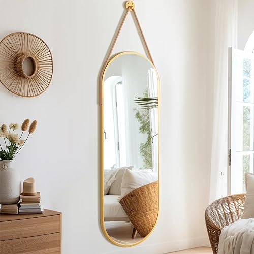 Adding a mirror to a room is an excellent way to make it seem bigger and brighter. This oval wall mirror can be hung from the ceiling with a dainty leather strap in a light brown tone to match any neutral-themed room. It will be a great addition to your entryway for a quick touch-up before heading out the door.